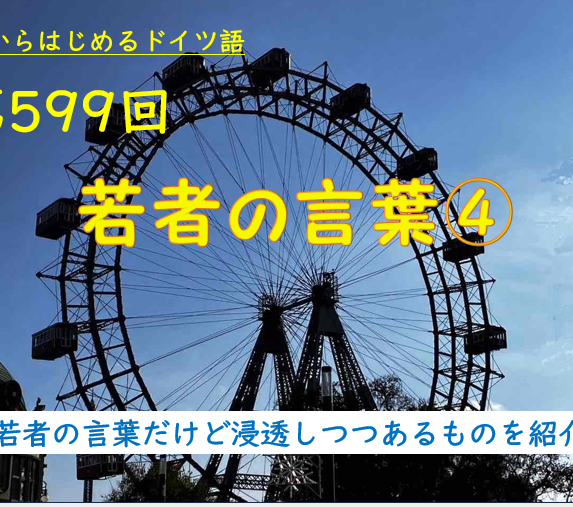 ・若者の言葉 今日も最近の若者の言葉を紹介したいと思います。私達60歳からのドイツ語読者は使いませんし、使えませんが、若者がその言葉を使っている時、どういう意味で使っているのか知っておきましょう。 …